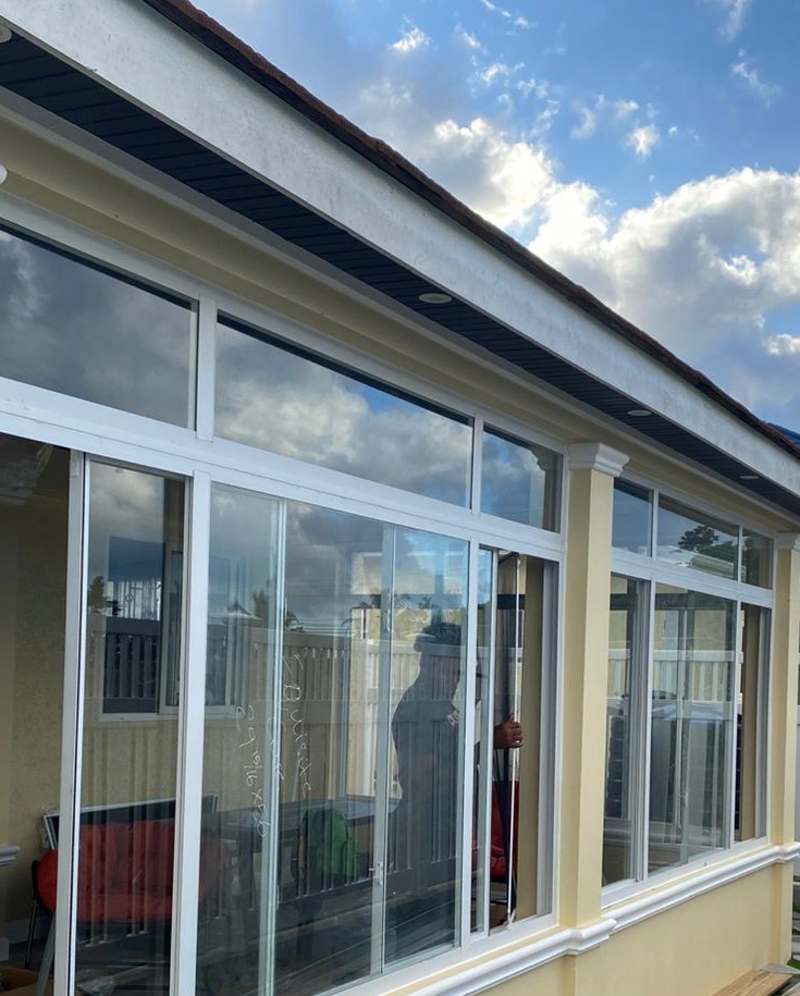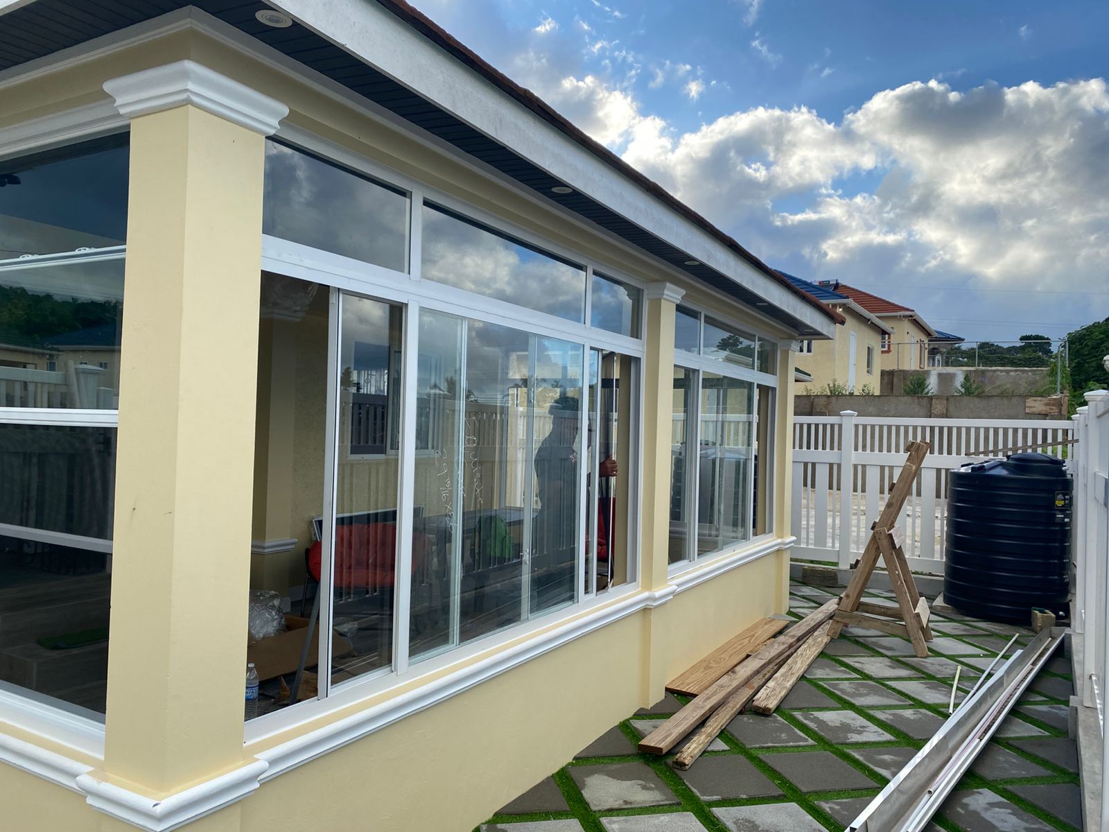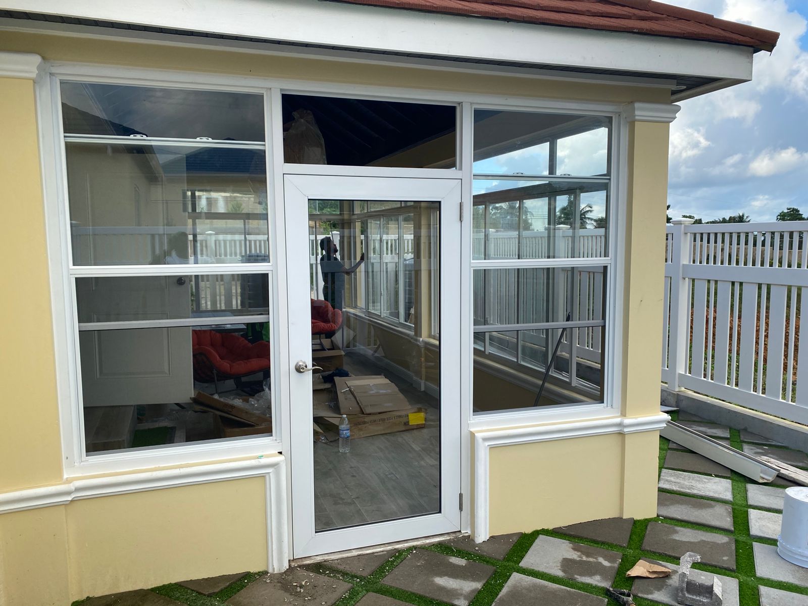 "This was a project for a home. This unit is an assembly of multiple combination units featuring both our Aluminum material and our Upvc material. Our Upvc material formed a cozy enclosed patio unit for the customer showcasing both our sliding windows as well as our fixed windows. On the other side of the patio we used our Aluminum patio swing door and to complete the unit we added our Aluminum fixed transom above the door and two sash windows at each side of the door for the perfect ventilation. "